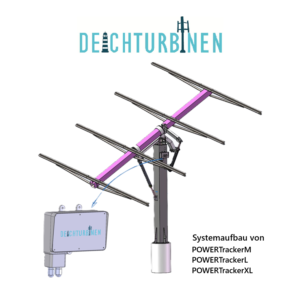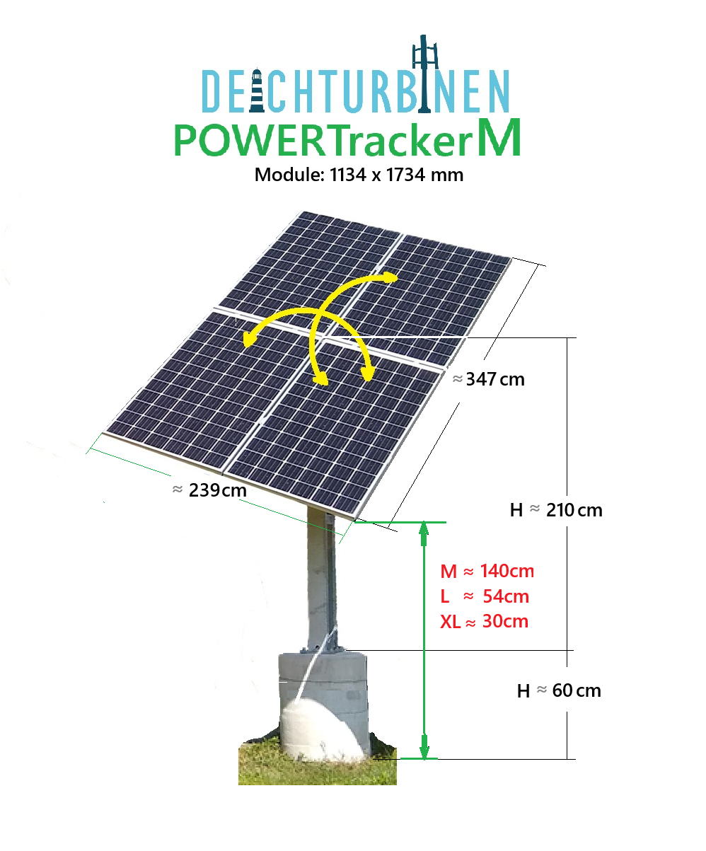| Variant | POWERTrackerM made of galvanized steel for max. 4 modules with 1134mm width, POWERTrackerL made of galvanized steel for max. 6 modules with 1134mm width, POWERTrackerXL made of galvanized steel for max. 8 modules with 1134mm width, 60cm elongation for vertical posts for POWERTracker M/L/XL, 150cm elongation for vertical posts for POWERTracker M/L/XL, ECOTrackerLight made of aluminum for max. 6 modules with 500-700mm width |