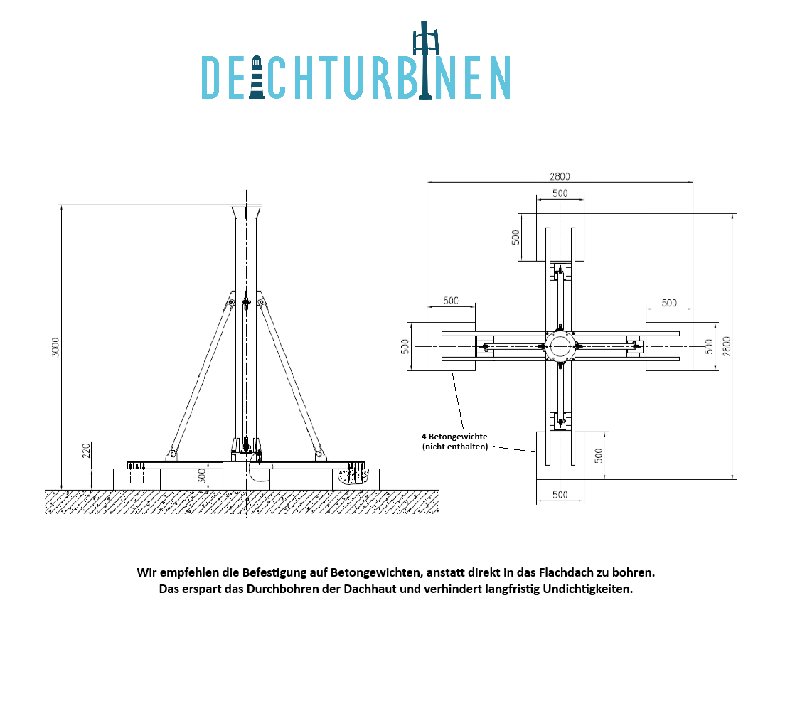 - Fastening directly to the flat roof or variant 2 alternatively on weights (without drilling through the roof cladding)