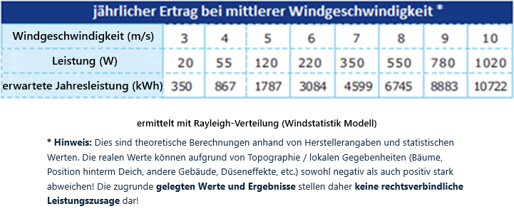 f.eks. elpris 0,40 EUR/kWh) -> 2950 kWh/a x 40 ct/kWh x 0,9 ≈ 1062 €/år * Årligt output (kWh/a) fra tabellen til venstre, bestemt med Rayleigh-fordeling (vindstatistikmodel)