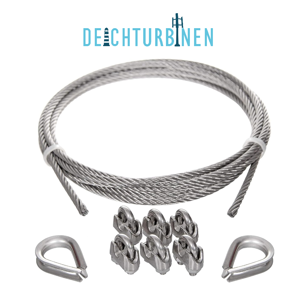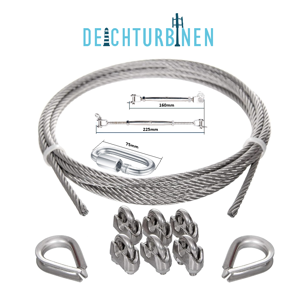 Variante-Ausstattung | Var1 Seil 1 Stück á 4,2m mit 6 Klemmen und 2 Kauschen, Var2 = Var1 plus 1 Wantenspanner 160-225mm und 1 Schraubkarabiner L=75mm, D=8mm, Var3 Seil 3 Stück á 4,3m mit 18 Klemmen und 6 Kauschen, Var4 = Var3 plus 3 Wantenspanner 160-225mm und 3 Schraubkarabiner L=75mm, D=8mm |